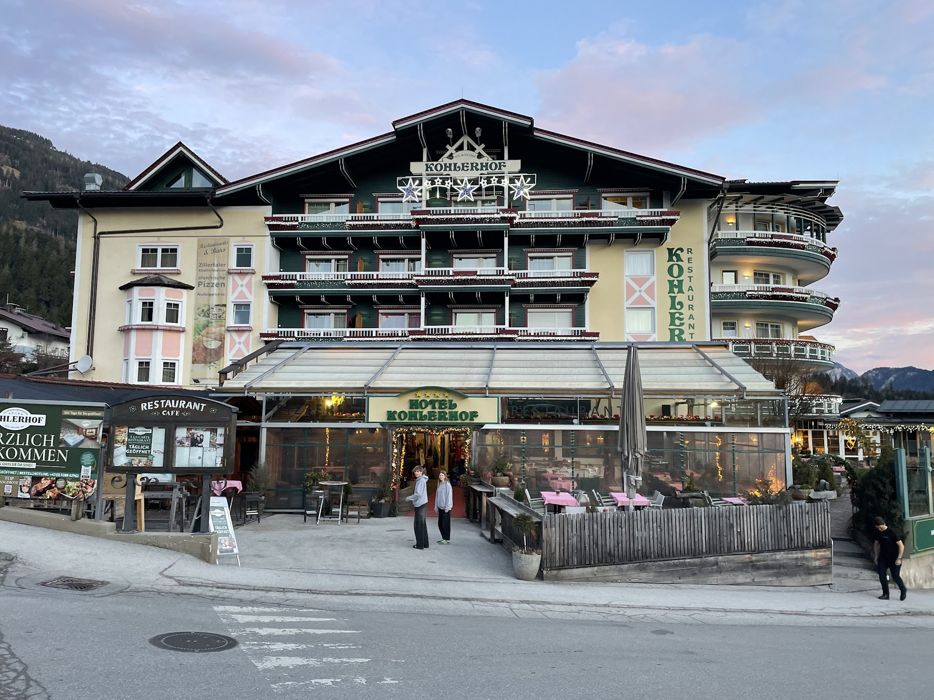We went on a week long ski trip with the family and chose Kohlerhof because of the good reviews here on Tripadvisor.||||But I guess we had some bad luck, because for starters one of the beds was broken. An hotel rep has come to our room to check it out but didn't change the bed or the room, "just let us know if you fall through, we will give you a new bed". Not a 4 star answer imo. But I must add that we didn't fall through the bed.||||Maybe that's because we didn't get that much sleep. We were in a room on the first floor on the street side, apparently right above a disco that was playing loud Schlager and dance hits accompanied by the drunk cheers of the visitors, sometimes till 4 in the morning. After the first night I told this at the reception, but they assured me this was an exception. Which of course it wasn't... ||||The rooms were very clean every day, housekeeping did a great job. There's no air conditioning and the room got quite hot at night. Too bad we couldn't open the windows because of the noise outside.||||The restaurant and service there was ok too, the staff seams cold and distant at first, but after you try to mumble some German with them, most of them were really friendly. But the restaurant is next to the bar. And in Austria you can smoke in bars. So early morning or late evening, you always smell cigarette smoke while eating your meal. Thank God we were seated in the restaurant, some people got to eat their meal IN the smokers bar, yummy...||||Make sure you check the opening times for the ski lifts, because the lifts in Fügen closed the week before we were there, so we had to drive for 25 km every day to get to Hoghfügen and back. This is not a fault of the hotel, but of the tour operator we booked our holiday with. This is why I've given only 2 stars for location, in winter I can imagine the location is superb.||||Also note that the spa is a nude spa, kids are not allowed below 16 years. We weren't told this by the tour operator either.||||So I guess this could be a much better hotel if you go in winter, without kids, learn German, start smoking and like to party...
