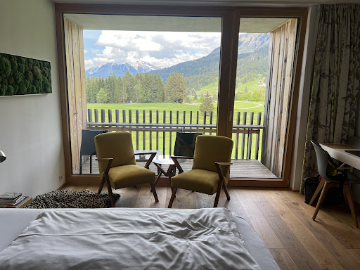 Read moreDer erste Eindruck war top: Rezeption zwar etwas zu klein geraten (Empfangsbereich hat eher einen Nebeneingangscharakter), dagegen das Restaurant mit seinen Nebenzimmern und Außenbereich sowie der Aufenthaltsbereich sehr großzügig und geschmackvoll gestaltet.|Super: Tiefgaragenstellplatz mit Aufzug.||Lage & Umgebung:|In wunderschöner, ruhiger Umgebung gelegenes Hotel. Den schönen Ort Riezlern erreicht man problemlos per Bus (Bushaltestelle direkt vor der Tür), zu Fuß ist es doch recht weit.||Zimmer:|"Zimmer und Suiten - komfortabel, hell und chic", so das Versprechen lt. Homepage. Für Gäste, die im Neubau untergebracht sind, bestimmt zutreffend. Wir hingegen, die uns für die 'Walser-Suite' entschieden hatten, wurden jäh enttäuscht: Aufgrund der Beschreibung war uns zwar durchaus bewusst, dass wir im Stammhaus einquartiert werden, mit Blick zum Innenhof. Auch, dass die Suite nur knapp 2m Deckenhöhe misst, stand im Text. Wegen den zwei (sehr vorteilhaft aufgenommenen, vermutlich mit Flutlicht ausgeleuchteten) Bildern auf der Homepage und dem eingangs zitierten Versprechen "hell und chic", glaubten wir jedoch, dass die 'Walser-Suite' unseren Ansprüchen genügen würde. Hinterher ist man immer schlauer: mit dem Aufzug im 2. Stock angekommen, Richtung Stammhaus (also Altbau) gehend, sank das Niveau schlagartig. Der Flur zu unseren Zimmern war eher altmodisch als chic (Teppichboden, Vorhänge am Ende des Flurs) und das Zimmer mit dem ausziehbaren Schlafsofa hat ein Fenster, vor dem ein Treppenaufgang verläuft; um Privatsphäre/Sichtschutz zu haben, muss das Plissee hochgezogen sein, wodurch das ohnehin schon dunkle Zimmer noch weniger Tageslicht abbekommt. Der Innenhof, in den wir von unserem nicht gerade einladenden Balkon aus hinunter blicken konnten, war noch nicht fertiggestellt. Die beiden Zimmer sind durch einen Durchgang miteinander verbunden, der aufgrund einer kleinen Stufe nochmal etwas niedriger ist; also nichts für Personen = 1,75 m. Selbes Thema im Bad: die Duschkabine: eng, keine Ablagemöglichkeiten und durch die Duschwanne nochmals erhöht, mussten wir uns bücken bzw. in die Knie gehen, um unter die Brause zu kommen. Beim Haare waschen stößt man an die Decke. Wir hätten uns außerdem mehr Stauraum für unsere Garderobe gewünscht; ein Schrank und ein Regal für drei Erwachsene zusammen ist doch recht knapp. Die Leselampen sollten separat geschaltet werden können. Zimmer und das Bad pico-bello sauber und die Betten wirklich komfortabel - was aber ja eigentlich selbstverständlich ist. Uns ist klar, dass man an der Deckenhöhe nicht viel verändern kann (evtl. eine barrierefreie Dusche?), und wo 'Blickrichtung Innenhof' steht, kann man kein Bergpanorama erwarten...aber allein schon aus eigenem Interesse, seine Gäste nicht negativ zu überraschen, wäre es fair, bereits vor der Buchung deutlicher auf die Unzulänglichkeiten dieser Suite hinzuweisen bzw. finden wir, dass die Walser-Suite nie und nimmer als 4 Sterne-Zimmer zu diesem Preis vermietet werden dürfte.||Service:|Die Zimmer werden, wie schon erwähnt, von sehr freundlichen Zimmermädchen blitz-blank gehalten; ein fehlender Zahnbecher wurde unverzüglich nachgeliefert. Das Service-Personal im Restaurant war ebenfalls sehr zuvorkommend und charmant. Die Dame an der Rezeption zeigte sich bei Fragen (z.B. zum Busfahrplan oder nach einem Fußweg in den Ort) hilfsbereit; sie blieb, auch nachdem wir unsere Enttäuschung über die 'Walser-Suite' vorbrachten, freundlich und versuchte, uns anderweitig unterzubringen; leider scheiterte dies für die erste Übernachtung an der vollen Auslastung des Hotels. Die zweite Nacht hätten wir in ein Doppel- und ein Einzelzimmer wechseln können, jedoch zu einem -unserer Meinung nach- unverhältnismäßig hohen Aufpreis.||Positiv: Nachdem wir beim Auschecken nochmals unsere Unzufriedenheit über die Art unserer Unterbringung zum Ausdruck brachten, bekamen wir von der Chefin einen annehmbaren Preisnachlass.||Gastronomie:|Essen ist ja immer Geschmackssache... aber für 4 Sterne ist durchaus noch Luft nach oben. Zum Beispiel möchte ich beim Hirschragout meine Preiselbeeren nicht in die Soße gemischt, sondern separat. Mehr Auswahl beim Salat wäre schön. Beim Frühstück: Obstsalat war leider mit viel unreifem Obst. Super: die Milch-Auswahl, verschiedene Säfte, Smoothies. Man sitzt innen wie außen sehr schön.||Sport & Unterhaltung: |Mit der Gästekarte Bus und Bergbahn genutzt. Im Garten gibt es ein paar Liegemöglichkeiten (Lounge-Möbel). Wellness haben wir nicht in Anspruch genommen. Poolanlage u. Innenhof...