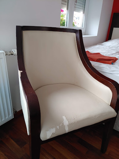 Die Bilder sprechen für sich: Im Badezimmer findet sich an mehreren Stellen schwarzer Schimmel und die Möbel sind abgenutzt und beschädigt. Am Schreibtisch in “meinem“ Zimmer löste sich die Laminierung. Der Fernseher ist anscheinend alt und entsprechend klein. War mir egal, da ich ohnehin nicht fernsehe.