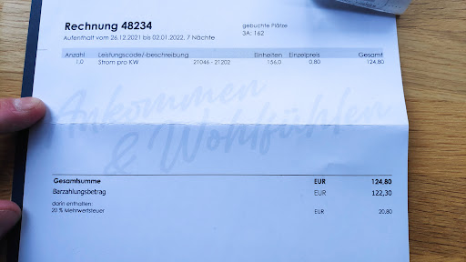 Stayed here for 7 days, only used Diesel heater for heating our campervan, we have no electric heater. And we have a a+++ small fridge which uses little power. We got a power bill which is way to much. It's even more we use at our entire home! The begin power kwh number can't be correct. I forgot to make a picture from the power counter, my fault, but 156kwh for only using the diesel heater can't be correct. It's even not really cold outside... Last time we stayed at this camping because receptionist could not help us further. Stayed here multiple times before.
