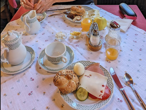 One of the highlights of our stay was the breakfast. Each morning, we walked over to the charming breakfast room in the adjacent building, where we were greeted with a rich buffet spread. The variety was impressive—freshly baked bread and pastries, a selection of cheeses and cold cuts, eggs, cereals, fresh fruit, yogurt, juices, and excellent coffee. It was a delightful way to start the day, and we looked forward to it every morning.