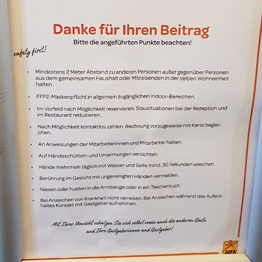 Very bad experience. I have booked (reservation n. 4869196295), a night with my wife from 15 to 16 September (breakfast included) while traveling from Germany to Italy through Austria. Falling sick on the 15th I couldn't travel on the 15th so we left too early in the morning of the 16th wishing at least to try the praised breakfast of the hotel. Unfortunately with the heavy traffic and rain near Munich that morning, and after an eight hour drive, I called the hotel from my car kindly asking if they would be so kind to offer us breakfast although with some delay (exactly 30 mn after the end of the "official breakfast time") before we continue to Italy. The answer was: " this is not possible, all we can offer you is bread and ham". I declined because my wife is allergic to meats including ham. To sum-up, I paid my booked night way in advance with breakfast included and when I asked for a service (that I paid for) due to an unexpected condition, they treat me as if I were a beggar or as if a breakfast for a couple that I asked for (although late due to force majeure) will impoverish that hotel. By the way, a hotel that doesn't have the ability to adapt wisely to such situations of their clients gives a bad image of itself. To conclude, that was the first and will be the last time I book JUFA...