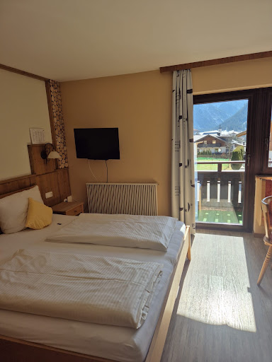 Wir waren rund um zufrieden. Die Auswahl beim Frühstück war sehr gut, es gab verschiedene Sorten Wurst, Käse, Marmeladen und Aufstriche. Ebenso gab es verschiedene Müsli, Milch, Joghurt und Säfte. Was mir sehr gut gefallen hat war, dass es auch frisches Gemüse und Obst gab. Eiergerichte wurden auf Bestellung zubereitet, alles sehr lecker. Wir hatten eine Ferienwohnung und ein neu renoviertes Doppelzimmer im 3. Stock. War beides absolut ausreichend für uns. Das Doppelzimmer war sehr schön eingerichtet und stets sauber er geputzt. Die Ferienwohnung ist etwas älter von der Einrichtung her aber sehr großzügig angelegt. Großes Doppelzimmer mit Balkon und großem Kleiderschrank. Bad mit Klo und Dusche. Die Küche verfügt über eine Kochmöglichkeit, Kühlschrank, Kaffeefiltermaschine und Minibackofen. Es befindet sich auch ein Tisch mit Bank und Stühlen in diesem Bereich, welcher zum verweilen einlädt. Zusätzlich ist eine Couch vorhanden welche als 3. Schlafmöglichkeit genutzt werden kann. Außerdem gibt es auch einen zusätzlichen Fernseher. Es wäre nur zu erwähnen dass es in der Pension keinen Lift gibt. Wir haben a er mitbekommen, dass die Besitzer gerne beim Gepäck behilflich sind, sollte dies jemand brauchen. Die Lage der Pension fa den wir sehr gut. Wenn man gut zu Fuß ist, ist man in 10-15min im Zentrum von Tannheim oder der Bushaltestelle. Es ist auch eine Einkaufsmöglichkeit...