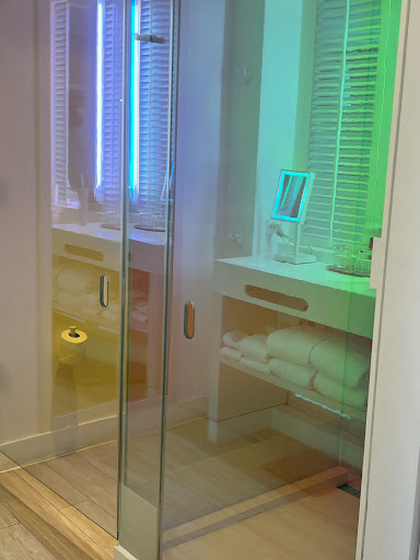 The SLS hotel room did not have enough towels, washcloths, toilet paper for the three of us in the room, we had to often ask for replenishment. There is NO door in the bathroom, only a curtain. The bathroom sink took time to warm and when using would splash all over. The shower design was not the best, as we had to totally step in to turn on, and there were no NON-slip strips in the shower, where we constantly were concerned about slipping and falling. The balcony did not have adequate seating and/or a table to sit out and enjoy a meal as a guest.