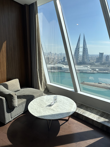 Read morePros: we checked in at 3pm as stated on their website upon booking and we were greeted by Raja at the reception desk whom was a pleasant and charming character. He gave us a room with a stunning view overlooking the Four Seasons, Bahrain Bay as well as the Bahrain World Trade Center. We did not even request for it but he told us we could have a late check out (3pm) the following day which was perfect because we were definitely enjoying all the amenities in the room. every staff member we came across with at the hotel was so friendly and helpful. it was our first time staying or even visiting the hotel so we were somewhat lost and flabbergasted at how modern everything was. Most of the lights were smart automated and could be pressed within a button (light switches and curtains). It was definitely an experience worth trying. the tub provided in the toilet was also a definite plus as the cold season has started a hot bath with a few bath bombs were just the perfect relaxation we badly needed. if you alot some time to go down to their pool deck on the 11th floor- you will come to find an infinity pool overlooking the World Trade Center. It was a shame the weather was 15*C that day and we simply could not enjoy a swim. we also appreciated the free parking accessible for hotel guests.