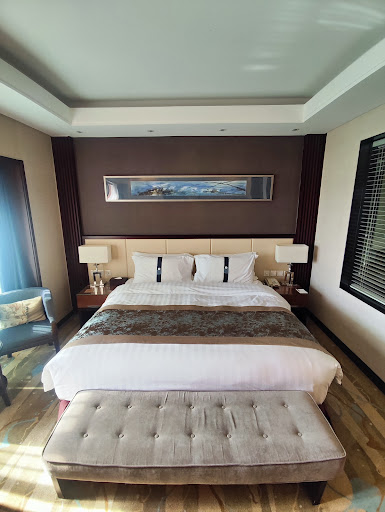 In the days leading up to my stay I had some good dialogue with the hotel, including prompt email responses and helpful advice. I took up the offer of the ‘business class’ transfer from the airport which worked really well. The main airport is some distance from the city but the driver was friendly and able to offer loads of advice on the hours’ journey. The car was good quality with bottled water provided. Despite being quite a bit more costly than a standard taxi it felt worthwhile, if only for the simplicity.||||Unfortunately upon arrival at the hotel there were no staff at the door to assist with luggage or point out the reception, which isn’t in the initial lobby area. The high ceilings and expansive open area was impressive though, as was the calmness of the whole place. The large water feature in the main lobby / bar area is great and is home to loads of fish which add colour and charm to the space. At the check in desks the staff could speak good English and the arrival process was easy. Given the expansive nature of the hotel, in hindsight, a more thorough overview of the facilities would have been appreciated, especially since the reception was practically empty when I arrived.||||My room was on the 7th floor, a standard double room. Although being the entry level room I was very impressed by the spaciousness and the balcony overlooking the front of the hotel. Although the balcony wasn’t large enough for any seats or table, and the view wasn’t too inspiring, it certainly made the room feel more high end than the basic option suggested. The desk in the room was large and housed some good stationary as well as the hotel directory. Some more information on the hotel’s restaurants would have been welcome within it though.||||The room was certainly very comfortable. The TV was a good size with BBC World News as the UK option and the air-conditioning worked well without being noisy. The bed was very large and incredibly comfortable with electric sockets on the bedside units, along with reading lights. In fact there was a lot of options for the lighting in the room which was great. The decor was a good mix of modern and traditional and I could easily have stated there for many nights with the storage offered.||||A big let down though was, despite being a five-star property, the mini bar was left empty. Phoning up from the room to have it filled was an awful task too - I ended up being put through to room service, who couldn’t speak English, and eventually had drinks brought open on a tray. Certainly the worst experience I’ve had in a hotel and I didn’t bother trying again.||||The bathroom was certainly the most impressive aspect of the room. Having a separate bath and shower room, both of which were huge, was great. There were plenty of plush towels provided along with loads of toiletries. The shower was a delight to use, coming hot quickly and having nice power and the view from the bath through the window to the room was great.||||The lobby bar was a lovely place to unwind with a drink and meal. For drinks it’s open 24x7 and on certain evenings there was a live singer which added a good atmosphere. A large screen inside and out shows live sport. The outdoor terrace was spacious and clean and food was served in good time. The menu has a good enough range and each item is reasonable value (except the steaks). The club sandwich was great but the burger was cooked extremely rare. There’s a good range of drinks available but the staff were inconsistent in providing nuts with orders.||||Checking out didn’t have the same positive experience as arrival - the member of staff seemed very unsure, not the best with English and it was a rather unprofessional experience. This was a shame because on the whole it had been a good stay. However the ordered taxi (which I was able to charge to the room) was duly waiting outside and the door staff ensured baggage was taken care of.||||If you’re looking for somewhere relaxing and quiet, yet still easily accessible in the city, I’d recommend here. It’s not in the heart of the action but that’s half its selling point. The walk to the centre is easy and takes around 15-20 minutes. Certainly for a nice room it wins although a few tweaks to the service would be good to meet the five-star...