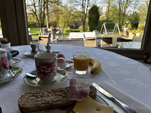 Le petit-déjeuner et les parties communes • Petit-déjeuner correct, avec une belle vue sur le jardin bucolique depuis la salle. • Le lounge à côté du restaurant est vraiment un endroit à part – cosy, élégant, parfait pour se détendre. • Dommage : le restaurant était fermé (samedi de Pâques, 19/04/2025).