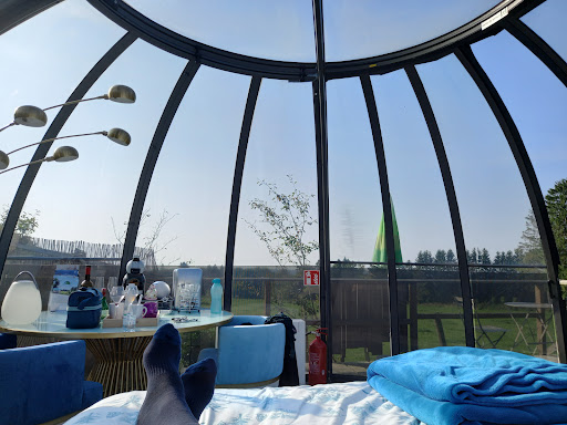 Read moreVoici un endroit d'exception, parfait pour une escapade au calme au sommet de la Belgique. Un accueil très sympa par la propriétaire, une explication claire des infrastructures (matériel complet à disposition dans la bulle, le jacuzzi, etc.). Nous avons eu la chance d'avoir une belle météo pour profiter de la terrasse, du jacuzzi. Le lit très confortable sous la coupole en verre permettant d'observer les étoiles, c'est magique. Nous vous conseillons le traiteur qui, a prix très modique (40 eur pour deux plats), vous amène une cuisine de qualité et copieuse. Le petite déjeuner est très correct lui aussi. Il n'y a pas de télé (mais pas vraiment nécessaire dans ce type d'endroit). Nous avions pris un ordi portable pour la musique et la connexion WIFI était de très bonne qualité malgré cet endroit retiré. Les commodités sanitaires avec la douche sont à quelques enjambées de la bulle ce qui assure une certaine intimité. J'ajoute, que suite à un petit ennui de santé, la propriétaire a été aux petits soins. Concernant la région, la Bulle est située à proximité du Signal de Botrange, de la Cascade de Bayehon (possibilité de belles balades) et du restaurant Le Mont Rigi qui est très bien lui aussi. En résumé, nous recommandons vivement...