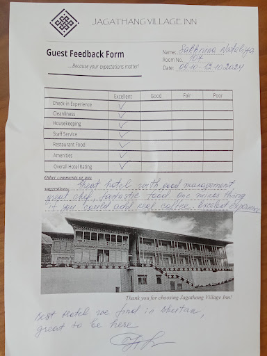 Actually we landed at this place by accident. Our tour operator shifted us to this place at the last moment as his customers from earlier batch had complained about his regular place which had construction going on for rooms expansions there dirtying and causing inconvenience at that place. That turned out to be a blessings in disguise and this place is awesome. Located a few kilometers away from the main city Paro, in the interiors, this place is less than a year old. Made very beautifully and paying meticulous attention to many details by the owner who has been in property business for years, it has come out very well. The landscaping and garden is very refreshing. Rooms are large with good quality furniture, toiletries, bed linen and other things in the room. Even bathroom slippers and bath robes are provided in the rooms. Rooms have balcony sit-out from where you can enjoy beautiful farms and mountain view. ( Please note that hotels in Paro do not have room ac and fans. However they can provide pedestal fans on your request). The staff is very courteous and cooperative. I must make a specific mention of the Manager Sonam. He is a very engaging and joyful person. In addition, the owner pays personal attention to ensure guests' comfort. The cafeteria is spacious serving either buffet or table served food depending on the occupancy of the hotel. However the options are a good mix of Asian and Continental dishes. They have two bars which are decently stocked. Overall a very nice place to stay at, strongly...