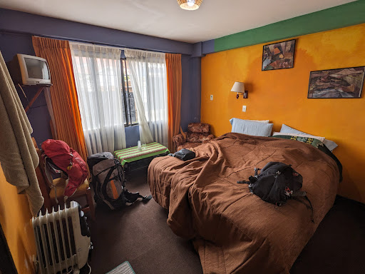 I ended up staying here last minute just for one night as I couldn’t keep going onwards to Peru as I was quite unwell. Thought it was a really great place, they were very welcoming and the design of the place is quite quirky and cool. I was thankful I could check in a bit earlier to lie down and check out a bit later for a small fee. I loved all of the murals on the walls and in my room. Having free bananas and coca tea was a nice touch. I didn’t end up paying for the breakfast as I was still quite queasy so can’t comment on that. The bathroom was clean and I appreciated the rarity of having the water not go everywhere on the floor as it’s built into the ground a little, unfortunately I didn’t get it to become too hot and when I turned the knob for more water I did get a little shock. But all in all I thought the room and service excellent. Loved the colour scheme of the room and my view to the llama next door and the lake. It is nice and close to the main strip of shops/cafes/restaurants and tour operators. Also not far to walk to/from the bus station or the boats from Isla del sol. Would happily stay...
