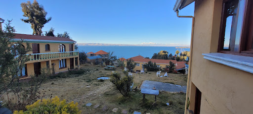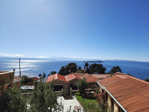 The view from our central top floor room (#12) was to live for, especially near sunset. Just below the island's ridge, Hotel Imperio del Sol has a great view eastward across Lago Titicaca, including both Isla de la Luna and the snow-covered mountains on the far side of the lake. Our double room with private bath was so nicely decorated that it took as a while to realize it was basically a basic room (with no electric outlets). The electric-heated shower was unusable because the water was literally hot enough to scald (with the heat on) or freezing cold with the heat off. US$70/nite, including breakfast and supper at the restaurant across the way seemed an excessive off-season price--perhaps why the hotel was nearly empty. Rooms with shared bath and breakfast only are US$35. Had the view from our room not been so extraordinary, we would have been quite upset--and many rooms didn't seem to have that view. WiFi was sometimes available, albeit not from the room itself. Note that, as with any hotel on or near the ridge, you must hike just over 1 km up an average 20% grade to reach Imperio del Sol--mules are said sometimes to be available to carry tourist luggage, but...