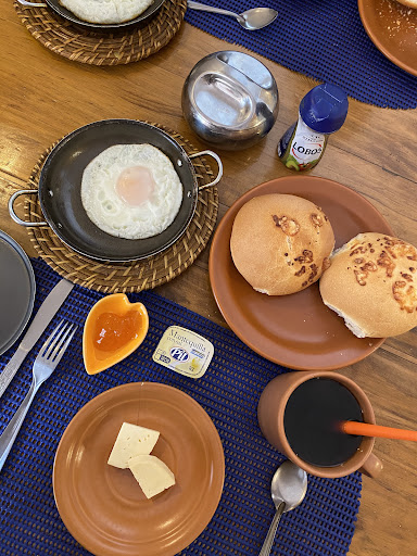Breakfast included coffee, milk, juice, cereals, bread, butter, jam, scrambled eggs and fruit salad!