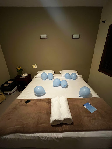 No dia 17, um dos nossos amigos estava de aniversário. Um dos colaboradores ouviu de longe quando demos os parabéns a ele. Dona Mônica, que cuidou do nosso café da manhã com tanto amor e atenção, preparou uma surpresa linda: a pousada organizou uma carta carinhosa, encheu balões azuis e fez um bolo para o aniversariante, deixando tudo pronto no quarto dele e de sua esposa. Foi um gesto que nos emocionou e que jamais esqueceremos.