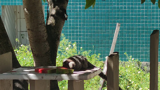 Café da manhã: comida normal que vc tem em casa, frutas, pão novinho, bolo, café, leite, suco, água, o bom e velho cuscuz.