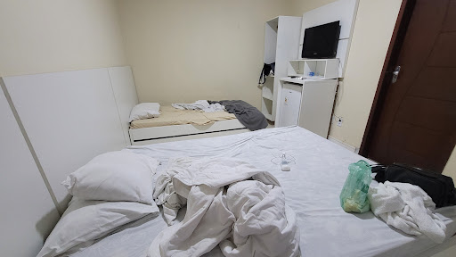 Read moreBom para uma hospedagem econômica. O estabelecimento é simples desde a recepção, passando pelo quarto (n°03) até o refeitório no entanto atende se você estiver buscando economia, boa localização e facilidades no entorno. LOCALIZAÇÃO: Boa! Tem muitas facilidades no entorno como trailer diversos, restaurante a la carte, buffet e a quilo, hambúrguerias, padaria, cafeteiras, mercado, hortifruti, farmácia e etc. É possível chegar à praia caminhando por 10 minutos. CAFÉ DA MANHÃ: Bem simples mesmo, mas atende no básico. QUARTO: Pequeno! Camas com colchão de espuma que estavam oferecendo suporte ortopédico, ou seja, estavam confortáveis. No meu caso haviam duas camas sendo uma casal padrão 138X188 e outra solteiro padrão 88X188. A televisão estava posicionada de forma que não é possível ser vista da cama de casal porque um armário impedia a visão. Não havia cabides. BANHEIRO: O blidex corria trepidando e não há prateleiras para shampoos e acessórios dentro do Box, mas apenas porta sabonete. Chuveiro elétrico com boa queda d'água. Havia vazamento de água do box através do blidex de forma que formava poça na area seca do banheiro, o que aumenta o risco de quedas. O espelho do banheiro apresentava marcas de envelhecimento comprometendo metade da visibilidade. As toalhas aparentavam bastante uso sendo que uma delas apresentava diversos rasgos nas laterais. Os quartos têm as janelas para o corredor de passagem de acesso aos outros quartos térreo e refeitório, o que compromete a privacidade obrigando os hóspedes a manterem as cortinas sempre fechadas. FUNCIONÁRIOS: Solícitos, acolhedores com destaque para o Rafael que fez meu check-in e me ligou após o meu Check-out para informar o esquecimento de um objeto. ESTACIONAMENTO: Não há, mas é possível estacionar na rua, em frente a pousada, com alguma facilidade dependendo do horário. OUTROS: Micro-ondas no refeitório para uso dos hóspedes bem como pratos, talheres e copos. Depois do horário do café o custo para usar a máquina de café é de R$5,00. Eu voltaria...