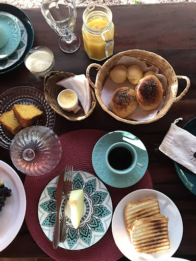 O café da manhã foi outro ponto alto da experiência, com uma variedade deliciosa de frutas frescas, pães caseiros, bolos e sucos naturais, tudo preparado com muito cuidado. Sentávamos na varanda, aproveitando o clima fresco da manhã e a vista incrível para o verde da Chapada.