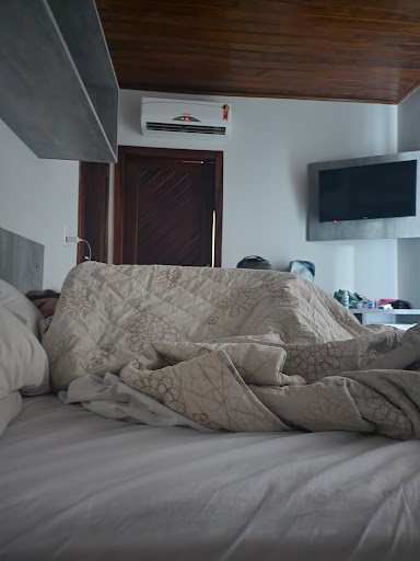 O quarto é bem aconchegante, mesmo que pequeno é o suficiente pra duas pessoas adultas. Ar condicionado funciona bem, televisão também. Chuveiro bem quentinho e agradável.