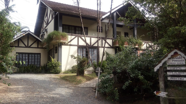 A Pousada Grun Wald. E um recanto as margens da BR 101 na estrada bonita em Joinville. A pousada tem arquitetura inspirada nas casas Germânicas. Muito Bonita e é di ida em duas partes. Ou dois lugares. Há certas coisas que precisam ser faladas. Ela transparece que já foi algo bem legal. Mas está decadente. 1°- Precisam se atualizar, sempre há bagunça nas reservas, pois uma pessoa faz por site, outra por telefone, etc e não se comunicam. Minha reserva não estava no caderno, e acabei ficando em um quarto.mais ainda. 2°- já passou da hora de trocar o ar condicionado dos quartos. Ouvi muita reclamação. 3° -Nos três dias que fiquei, não vi limpeza nos corredores, não trocaram toalhas, etc. 4° - A piscina e bem legal, mas quem a mantinha limpa eram os hóspedes, faltou uma limpeza nas bordas, etc. 5° - o Wi-fi não funciona na segunda parte da pousada que fica u s 40 metros da primeira. 6° Faltou a pousada organizar, ou avisar que não faria nada na virada do anos dias subsequentes. Tem pouca tele entrega perto, e o1° restaurante que funciona a noite fica á 6km.