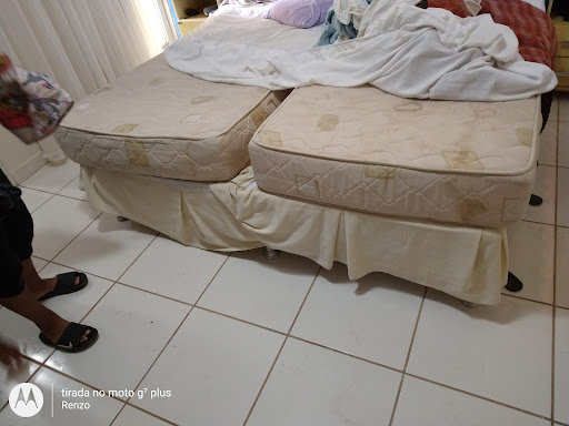O quarto não tinha aparência de limpo, paredes descascando, porta quebrada e descascando, a cama de casal muito desconfortável (era duas de solteiras que juntaram) pedimos um quarto com ventilador e o ventilador tinha muita poeira, provavelmente não era limpado por muito tempo. O banheiro estava com a tampa do vaso quebrado, a descarga quebrada, papel higiênico ruim, o chuveiro dava choque e a água do chuveiro ia pra todo canto, mal dava pra se molhar, o boxe do banheiro estava muito difícil de fechar e o banheiro estava sujo, não achei o lugar higiênico. As toalhas que deixaram pra gente tinha mancha amarelada.