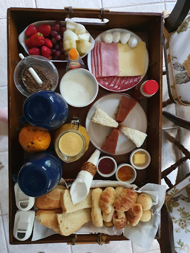 Pela manhã, tem um café farto levado ao quarto, com o destaque para o croissant, pães de queijo e, principalmente, as geléias!