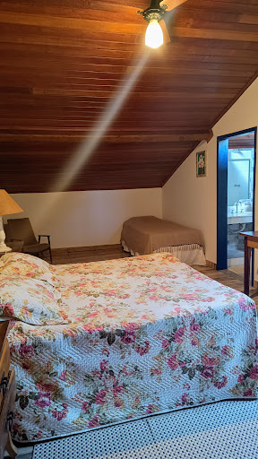 Read moreOs quartos eram enormes, muito bem estruturado, banheiro enorme. Mas, quanto a limpeza das roupas de cama não posso falar o mesmo, pegamos uma onda de frio nos dias que estivemos na hospedados e acabamos usando todas as cobertas e umas delas tinha o cheiro de perfume, não era amaciante ou algum produto que dava cheio. era um perfume importado e outra tinha cheiro de mofo, acredito que não ocorra lavagem das cobertas entre uma hospedagem e outra. O lugar do café da manhã e pouquíssimo estruturado para dias frios, nos dias que estávamos hospedados, a pousada estava cheia, e não tinha mesa para todos sentarem, estávamos em 4 pessoas e tinha mesa de 3 pessoas mas não podíamos sentar, porque não podia colocar mais uma cadeira que estava vazia em outras mesas, tivemos que aguardar liberar mesa de 4 pessoas, e no espaço não tem nem onde aguardar pois é pequeno. O café da manhã e bom para quem gosta de frutas e bolos com muita calda, opções salgadas praticamente não tem, somente pão, um pão de queijo bem mais ou menos e uma opção de torta. Deixo elogios a funcionário Patrick que nos tratou muito bem durante toda a hospedagem dando todo o suporte e atenção necessária. Sobre a localização nos não tivemos problemas, confesso que ao chegar por volta das caminho de cima, nos assustamos um pouco, mas chegando na pousada, eles nos explicaram um novo caminho, e íamos para todo lugar a pé, sem maiores problemas, um único dia a noite pegamos o carro porque estava muito frio, mas em dias quentes creio que não haja...