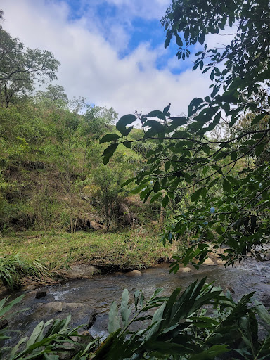 Chegamos numa sexta-feira à noite. No dia seguinte, levamos a Ayuky para aproveitar a cachoeira — um espaço aberto, natural, onde ela se comportou com tranquilidade. Em determinado momento, outro cachorro apareceu, e, naturalmente, Ayuky demonstrou curiosidade e vontade de interagir, como qualquer cão sociável faria. No entanto, por ser uma bull terrier, sua presença já causava olhares tortos.