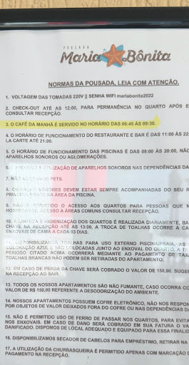 Maria Bonita is ok, above of what you can expect for a pousada in Brazil. We arrived here around 3 AM and the front desk was open ( that's a good one for a pousada). As far as I know there is no parking but the street is quiet enough to find a parking spot and leave the car. The room is spacious and comfortable. One double bed, one single, big closet, in room safe, free fast reliable WiFi, big desk and flat TV. Bathroom is modern and clean. There is a nice pool overlooking the beach and towels are offered for free. Breakfast is the traditional Brazilian buffet: fruit, bread, cheese, ham, cakes, yogurt, juice coffee, tea and milk. The only thing that kept adding the fifth star is the fact that even the property is on the beach the room windows are small and facing the side of the property...