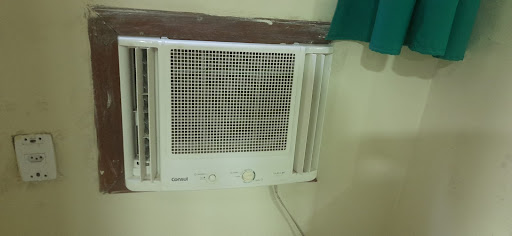 o quarto mesmo também havia duas camas, ar condicionado bem antigo, daqueles que liga e desliga na mão, mobília velha também.