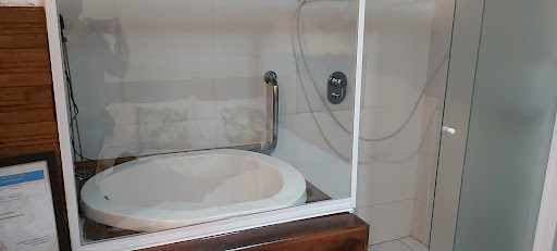 O chuveiro é elétrico. Dá pra regular bem a temperatura. A pressão da água não é da maiores, mas dá pra tomar um bom banho. E o banheiro é grande com muitos ganchos, como a gente gosta e uma pia e espelho enormes. Só a porta que precisa de um cuidado maior, pois é uma porta camarão (aquelas que dobram ao meio). Então não se pode puxar ou empurrar a porta com força. Tem que ter jeitinho. O sabonete líquido para banho e shampoo ficam num dispenser na parede dentro do box. Quebram o galho, mas achei que a pele e os cabelos ficaram um pouco secos. Então preferi usar meu sabonete liquido e shampoo que levei.