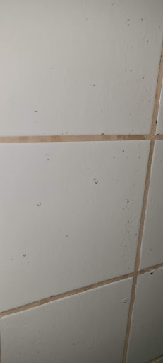 O guarda-roupa também estava em condições precárias, com manchas visíveis que pareciam estar ali há muitos anos. Porém, o ponto mais alarmante foi o estado do banheiro. O ambiente estava completamente mofado, com manchas brancas visíveis na pia e uma torneira suja. O espelho estava quebrado e a janela, assim como os azulejos, estava com sujeira e mofo acumulado. O chuveiro estava com quase todos os furos entupidos, o que comprometia a experiência.