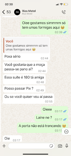 QUARTO CHEIRANDO BARATA, FORMIGAS NO QUARTO, RESTO DE SABONE USADO NA PIA DO BANHEIRO TOALHAS IMUNDAS E NADA DAS FOTOS E MUITO MENOS DA DESCRIÇÃO EXISTE PROPAGANDA ENGANOSA TOTAL Atendimento do WhatsApp rápido e prestativo, chegando no motel a moça da recepção nos entregou DUAS CHAVES de dois quartos DIFERENTES pra gente poder escolher NENHUM DELES ERA IGUAL AS FOTOS as fechaduras não fecham corretamente e estava cheirando mal, depois ela pediu pra moça que faz a limpeza nos mostrar outros quartos disponíveis. (O atendimento da moça foi tão bom que ficamos sem graça e com vergonha de ir embora pois eu vi AS FOTOS e quis reservar. A fechadura do quarto já não estava mais abrindo pelo lado de dentro mandei mensagem e moça ainda cobrou 100 reais NÃO CONSEGUI CHEGUEI A FICAR NEM 50 MINUTOS no quarto enquanto conversava com minha namorada e decidimos irmos embora. DECEPCIONANTE DEMAIS E NADA É IGUAL AS FOTOS ELES DEIXAM “ESCOLHER” OLHAR “TUDO” O quarto ja era pra estar limpo as coisas do quarto DEVERIAM ESTAR FUNCIONANDO E O VALOR ANUNCIADO DEVERIA TER SIDO O MESMO FORA O CONSTRANGIMENTO DE TER QUE FICAR “PASSEANDO NO MOTEL” PRA ESCOLHER UM QUARTO DECENTE PORQUE NÃO TEM NADA A VER COMO NAS FOTOS HORRÍVEL DEMAIS ! Eu só quis ir EMBORA E FUI NÃO DORMI LÁ SEM CONCORDAR PAGUEI OS 100 pela VERGONHA E FUI EMBORA Atendimento bom QUARTO HORRÍVEL LIMPEZA HORRÍVEL...