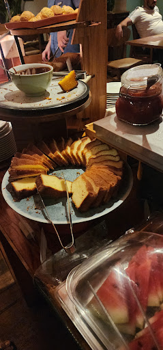 Na hora do café da manhã nós podemos acaompanhar os nossos tutores, pois tem um área externa, com plaquinha "espaço pet" e potinho de água disponível.