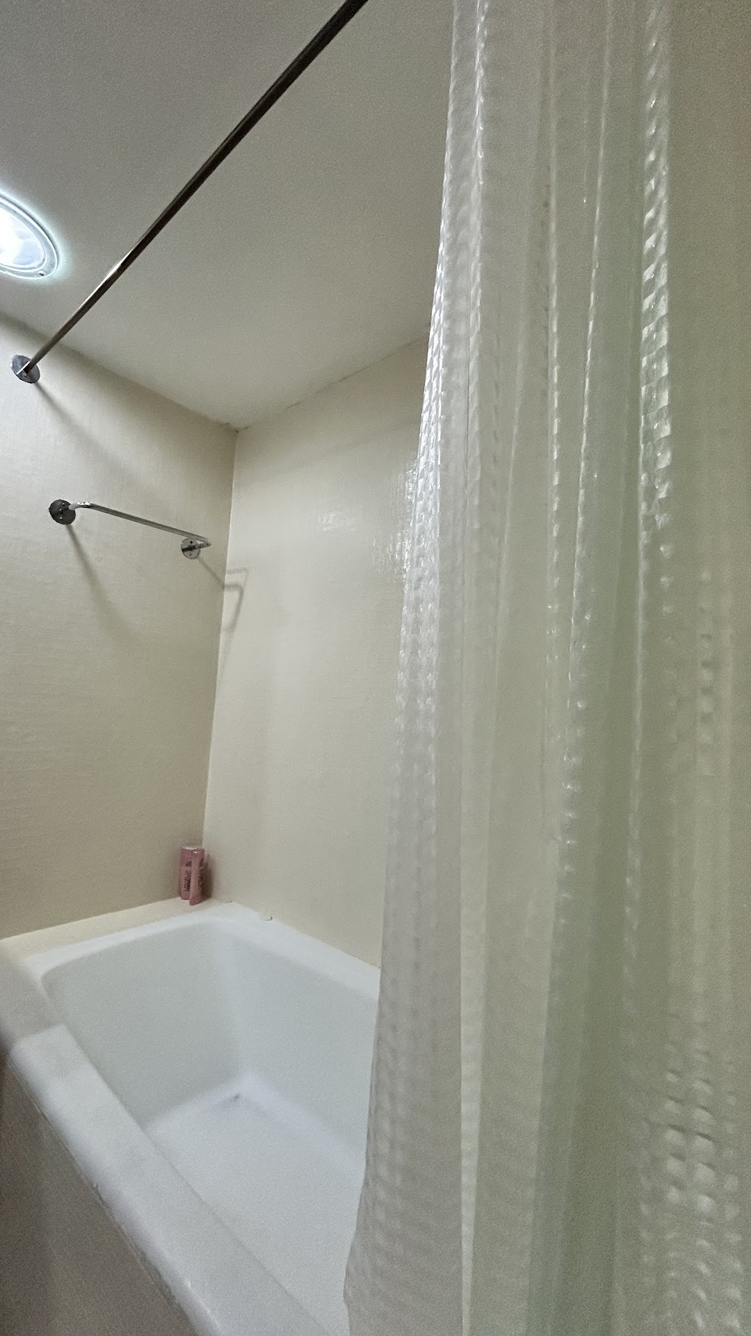 Uma banheira de cimento, com um chuveiro velho e enferrujado que cai dentro dela, e uma cortininha de plástico, no estilo daqueles filme do Freddie Krueguer.