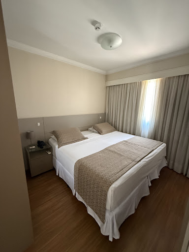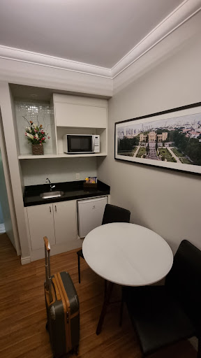 I had booked this hotel for our last nights' stay in Sao Paulo since it is within walking distance to the Ibirapuera Park. We unfortunately arrived in SP from Rio on a rainy night, hence found ourselves swamped with late Saturday night traffic due to road closures and traffic diversions enroute to our hotel.|The hotel is situated in quite a vibey part of town, with a noisy neighboring bar immediately noted on arrival.|I had booked the superior suite, so was rather disappointed to find a twin bed setup in a very tightly spaced room. There was absolutely no space between my bed and the wardrobe, and we both felt as if our feet at the end of the bed were just about resting on the TV mounted on the wall at the foot end of the beds.|Although there is a nice adjoining lounge area with outside balcony, this Suite can hardly call itself superior!!|The adjoining bathroom is also a tiny space, but at least with a decent shower.|There is no tea or coffee facility in the room, but there is free coffee available in a flask at reception. |There is also a reasonably-priced mini bar available in the room. |The included continental breakfast in the morning provides a good selection of fruit, pastries, cold meats, cheeses, and a couple of hot dishes.|The concierge allowed us to store our luggage the next morning at checkout, and we took a very comfortable and relaxed 27 minute walk to the Ibira park.|The hotel is approximately 40 minutes from the International Airport...