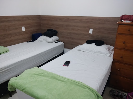 Prós: menos de 100m do BOS Sorocaba; o quarto tem uma cômoda grande e uma prateleira de plastico de 4 andares; Camas de solteiro box novas e confortáveis; piso limpo de porcelanato; ar condicionado novo; frigobar modesto;