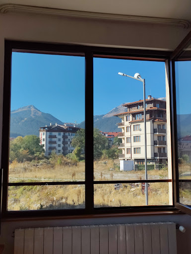 This is a well-maintained, modern and spotlessly clean block in the skiing part of town, about 15 mins walk to the lift carrying equipment.||This part of town has a great range of shops (mostly selling ski kit and souvenirs, but including some basic food shops) and restaurants ranging from great kebab stands to more classy places. Those prepared to walk 10 mins can get to the Old Town where you might seek out traditional “Mehana” where, for a very reasonable price, you get a selection of Bulgarian dishes, open fires (used to barbecue), cheap beer and maybe even live music.||Our apartment was large – two big bedrooms and a decent sitting room (also configured as a bedroom) with a huge bathroom and separate shower room, each with a toilet and basin. So plenty of space for a family of 5, probably 6 or 7, with loads of storage. What was badly missing was a kitchenette – an apartment without a kitchen is more “no catering” than “self catering”. We had to buy plates, bowls and cutlery, as the hotel breakfast (good value and nice on the one morning we could have it) started too late to allow us to join the lift queues first thing.||Beds were comfortable, spoilt by spongey pillows (insufficient in number) and bed sheets which were far too small.||The internet was free and worked well.||The biggest disappointment was the swimming pool. This has not worked for many years (we were told) and yet this is advertised on some websites as a hotel with a pool (same website said there were safes in the rooms). Apparently there is a sauna and massage which is not useful for a large group of children.||Overall – good value, convenient, large and well-maintained. Would benefit from earlier breakfast, kitchens in the flats, filling up the pool and...