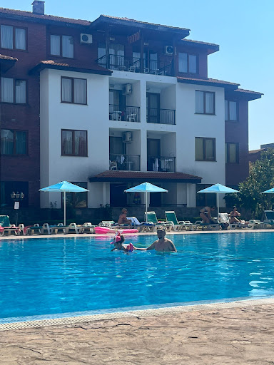 Place is nice and clean, great pools and quite close to the beach. However... It's a huge pain to find - no signs and as far as I know, the only way to get in to reception is to either have somebody let you in, or call and try to figure out which of countless gates they are going to meet you. Walking to and from the beach is another experience, narrow dirty road that looks like it has come under bombardment lately. Parking is extremely unorganized and very hard to find at times. Bathroom is another thing - the floor is the drain for the shower, with the lowest point being right in front of the toilet. So it's always wet there. While on the topic of bathroom - you are entitled to only roll of toilet paper at a time, so if you run out - you have to go and ask for more. It's not this place though - the whole Bulgarian seaside is like this. Has huge potential, but lots of things that you kind of come to expect everywhere else seem to be a premium luxury or not available at all...