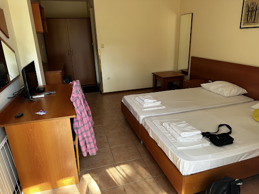За таку ціну доволі хороший готель. В номері є: 2 односпальні ліжка (досить зручні, місця для людини достатньо), необхідна постіль до них (по одному комплекті), додаткові подушки, пледи 2 рушники на людину (більший та менший) працюючий телевізор (канали лише болгарською мовою, звісно) працюючий кондиціонер кавовий столик 1 крісло "письмовий" стіл з тумбою, де також є правила перебування в готелі невеликий диван (скоріш за все, розкладний, ми не перевіряли) по 1 тумбі біля ліжок з настільними лампами (не перевіряли, чи лампи робочі, нам це було без потреби) шафа для одягу з великою кількістю вішачків, що дуже приємно, та й поличок було достатньо, в цій же шафі був сейф, проте без ключів, ця послуга платна відокремлена міні-кімната на кшталт переходу від основної кімнати до ванної, в цій же "кімнатці" знаходився стіл з тумбою і шухлядою (в якій був фен), а під столом був міні-холодильний і поруч сміттєве відерко, також над столом були полички з підносом і 4 скляними стаканами (не дуже добре вимитими, на жаль) у ванній кімнаті стоять поруч душ з туалетом, і це нормально, проте і мови не йде хоч про якусь перегородку, ні дверцят, ні шторки... Під час душу будьте готові до того, що вся вода буде попадати і на раковину, і на речі на ній, і на туалет, і на всі стіни, тому, щоб витертися потім сухим рушником після душу, його краще лишати за дверима ванної, до речі, на туалетний папір також може попасти вода, а ще на відстані метра знаходиться розетка, ніби і прикрита, а ніби і закріплена не дуже добре, будьте обережні біля самої раковини по 1 запакованому милу на людину, а також по 1 шампуню/гелю, як на 4 доби, то це замало; добре, що ми мали ще з собою додатково все необхідне є додаткове відерко для сміття в туалеті бойлер (великий +, гаряча вода була завжди) сушка для одягу