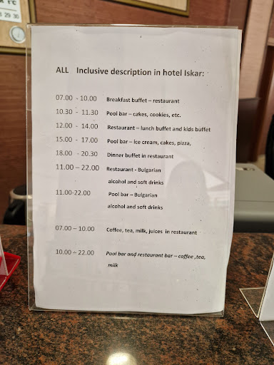 Read moreI would like to leave a positive review but can't. This is the worst all inclusive I have stayed in for the food. Lukewarm and unappetizing. Even freshly put out pasta wasn't even warm. I would like to have tried local dishes at the hotel but it was difficult to know what the food was. The bean stew was probably the best dish I had at dinner. Anything nice such as fresh cherries are taken by the loaded plateful and then often left, leaving others with nothing. The room we had was large and clean but a throw back to the 70s, at the back overlooking the pool, in the shorter block. Our studio had a fridge, kettle, hot plate, crockery and cutlery! The hotel was possibly one of the first built in the resort and it shows. The staff are miserable. Very difficult to get a smile despite our best efforts. Most of the guests are East European which is to be expected but we didn't feel welcome. No entertainment but music playing during the day. There is also a small quiet pool. The biggest seagulls I've ever seen fly overhead constantly screeching. When wasted cakes etc are left out by guests they divebomb the pool area. Lots of shops and bars nearby. Weren't hassled by the staff as can happen in other countries. It was quiet at night but impossible to close the room door quietly. Double glazing was good, as was air conditioning. The beach is close by and lovely, as is the sea. The weather was good. Some cloud, one light shower. I like to try different countries but won't be returning to Bulgaria or recommending it. There are much nicer places...