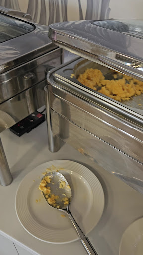 Завтраки и ужины тоже организованы не самым лучшим образом. Помещение без кондиционера, на улице +33, дверь настежь, поэтому в жаре еда вся плавится, сыр, салаты, колбасы выглядели обветренными и несвежими. Лазанья на ужине была с ветчиной (ощущение, словно готовили из остатков с завтрака). Над фруктами и десертами летают мухи, так как свободно залетают с улицы через открытую дверь. На улице невозможно отойти от стола, еду сразу атакуют чайки! Столы и сидушки в их помёте. Сидушки есть только у некоторых стульев.