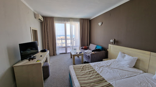 Read moreOn July 4th my girlfriends and I decided to visit this hotel for a long weekend getaway! When I was packing my luggage the previous day I decided to phone the reception to ask if we need to take towels for the beach - no one answered (it was 20:00 - a hotel claiming to have a 24h reception and four starts). No one returned the call so we decided to take some. When we arrived at 12:35 the girl on the reception desk started to check us in, which was great taking in consideration that the check-in was after 14:00. We asked where and when the lunch is and she kindly informed us that we do not have lunch the first day (AI rate) and if we want to have lunch today we need to skip it the last day (weird).||When we went in the room, it was clean, spacious and welcoming. I decided to take a shower so I went to the bathroom. When I entered I discovered that unless I lock the door I cant close it, so I locked it. I entered into the shower cabin and closed the door - then I realized that I forgot my soap and tried to get out but the shower cabin door was stuck in the edge of the tile which was higher than it should have been so I was stuck in the glass shower cabin with the bathroom door locked and no towel handy...I panicked thinking that I will need to pull the panic robe and the personnel will see me naked so I pushed and pushed untill I finally managed to escape. When I ran the water, I found out that the shower phone is broken and water was pouring everywhere and it got better - the shower head hang was also broken so the only way it stood on the wall was so high that I had to be half way out of the cabin.||We made it to lunch. The choice was scarce and cheap. It didn't seem like any other AI lunch ever - beans and cabbage, badly cooked rice and plain pasta. I grabbed a few bites and decided to take a cup of coffee. When i went to the bar, the extremely rude guy (Angel) informed me that coffee is served only at breakfast and that this is his orders so he cant give me coffee. I was shocked that in an AI hotel where I paid as much as in any other 4* hotel (I recommend Duni Royal Resort if you want something worth the price) I was not served coffee at lunch... (On the second day another guest told us that there is a Nescafe machine where you can get an instant coffee which was actually better than the espresso).||We went to the beach and we discovered that this hotel doesn't offer a single umbrella for its guests (Thank God we took one).||At the morning when we went for a coffee (finally) Angel was serving it with half thumb inside the cup! This was repulsing! ||I don't even want to mention that half of the personnel was acting unprofessional except Manuela - she was so polite, always greeting, smiling and answering all our questions! Thank you Manuela! I would like to thank Atanas the bar tender as well. He was very polite too!||Last but not least - for four days no one changed our towels a single time... ||||In summary: no umbrellas or beds at the beach, the food was not of a high standard and not diverse, the service was............unbelievably unprofessional and the room maintenance was at a very low level. I DO NOT...