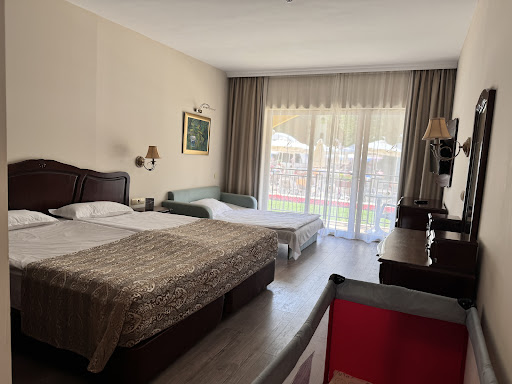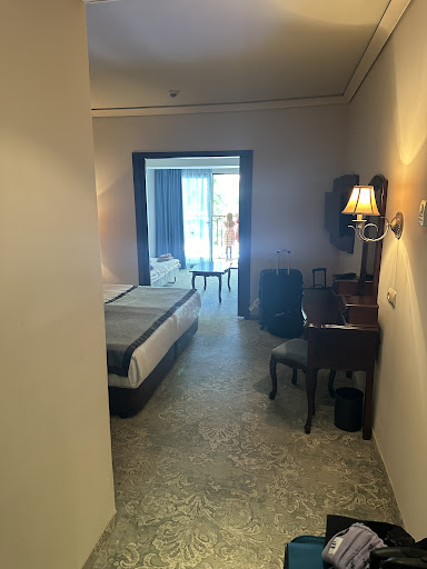Les points positifs: le personnel professionnel qui fait de son mieux dans des conditions qui ne sont pas toujours les meilleurs. L'accueil en français à la réception. L'accueil à l'entrée du restaurant principal où le personnel vous trouve une table en 30 secondes. 2 grands piscines extérieures + 1 piscine enfant/toboggan extérieur + 1 piscine intérieure + l'accès aux trois toboggans de l'aqua park l'animation par les animateurs en journée et en soirée l'hôtel est à deux minutes de la page avec chaises longues et bar à disposition des clients Grifid les boissons dans le frigo de la chambre est rempli tous les jours à chaque consommation d'une boisson, eau, bière, pepsi et fanta a dispostion.