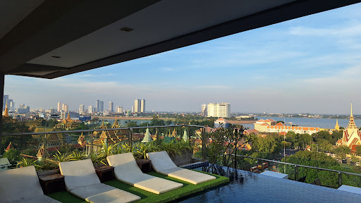 Read moreNever having been to Phnom Penh, I didn't know what to expe t. The hotel had good reviews and seen ideally positioned to acess the main tourist attractions and close to Bassac where the nightlife happens. On arrival, I was greeted with smiles and good information. The lobby has a tourist info rack...definitely take the maps and main attractions info. My room overlooked a religious site and the street at night was very peaceful. The usual fixtures in the room and all in excellent working order. The shower is fed with a small resevoir of hot water...didn`t know tbat....so I questioned why I had no hot water minutes into my shower...once explained, I used it accordingly and got the hang of how to set the water to get a long hot shower. The shower was standard hand held device and my favourite, the rainmaker head that gives a wonderful deluge of hot water. Bed was queen size, comfortable and situated such that the gentle air conditionjng kept me cool and comfortable every night.Room safe was fully operational.Room serviced by a lovely lad who was always happy and efficient.Try the Sky Bar and roof top pool. The views are stunning. Tonle Sap and Mekon rivers, Royal Palace, gardens and river front along with a great panorama. Staff are very helpful and prices are competitive.The evening meal, on the roof top, open air, with the hustle and bustle of the city 11 floors below is to be experienced. The bar is well stocked serving draught and bottled beers alongside a very fair selection of spirits.Breakfast the following mornjng 6am to 10am (but its not rigid, so if people still there 10.20, well, no rush. Food variety was limited mainly: chicken with rice or noodles, sausages, beans, egg and a noodle and egg station outside. All self service. Toast, nice selection of baguettes, white and very brown bread options, jams, fruit and cereals. Fruit juices (blackcurrant or orange) and hot tea/coffee free flow.One very nice aspect is the free water refills. The bottle in the room is refilled by the unit in the breakfast room, as many times as required. Keep some in the room fridge for refreshing drinks after a long sweaty day.Finally the little cafe downstairs does a solid range of hot or iced drinks and it closes 3pm. Opens at breakfast.No guests permitted so guest's 'stuff' is safe. The doors are locked circa midnight, but as I am still a late night hound, getting back in was not an issue....just bang loudly on either of the two doors. Use Tuktuks from Grab. Not once got a problem. Plenty of freelance tuktuks touting but prices are variable one sentence to the next. Local bistros and small foody places. Try Vine, run by Aussies, good grub, good drinks, very popular with Aussie expats. Every member of staff here could not do enough for thecresidents, thus making their stay highly enjoyable. I would look to book this hotel again. Highly...