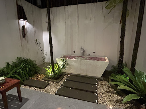 The room was large with a king bed ( slightly firm for American standards ) and big bathroom and outdoor tub and shower and the room beautifully decorated with flowers for our honeymoon. I’d recommend only showering and bathing outside as it is a great experience! A/C worked great and we had no problems with bugs despite the open air concept of the hotel.