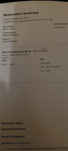 I am still so disappointed in how our booking went. We went here for the first time in 2023 in a tent site. Loved it and loved these Waterfront sites even more! So we booked early this year to secure a Waterfront tent site for the summer. Great. They did change their booking system that even the staff had issues when I called but this very lovely lady tried hard to book it and called me back once it was all sorted. But just a week before our trip, I clicked on the link in the email and it said that we were booked in a boondocking site (with many other tent sites) with no car access. Not at all what we were looking for. When I called about it, the lady said they would try to get that party in our original site to move. Then we were offered a free bundle of wood (during a fire ban). Then they called back saying that we must not have paid an additional fee to "lock in" the booking which was not even an option when we booked. In the end, we cancelled and found Clearsprings Campground in Caroline (peaceful property run by a lovely couple)! I was just so fed up that Camp Rocky Mountain House would not own up to their mistake. Then when we came back from our trip, I found this print out I had printed out (thankfully!) which states the initial booking was for exactly the Waterfront tent site locked! It was an error on their end where we ended up getting moved to a site with no privacy or car access and not along the river. Downfall of having only a link to lead you to your booking! Print it out in case unwanted changes are made. Just so disappointed they couldn't admit that they messed up. I really wanted to camp there again but had a...