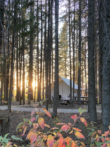 We stayed in a trapper tent which was very comfortable although a little cold at night. The parking pad across from the tent was just big enough for our truck; we did have to park at quite a steep angle as you can see from the photo. There are one set of flush toilets lighted at night which are near the cabins.