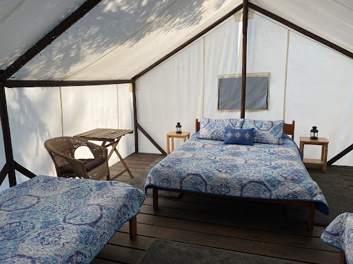glamping tent- the beds are very hard. There are lots of blankets on the bed. You will need them. It got very cold at night. The river is very loud and is 20 feet away from the tents. Showers- good. I never had to wait for a shower for more then 2 minutes. The water was temperature was good They even have shower mats outside the door for each person to use and then throw in the laundry when they are done. I showered twice and each time there was none...
