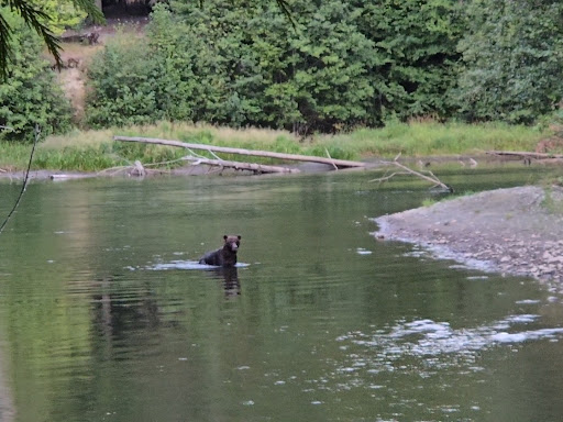 This campground has a nice area by the river to view bears. The Tweedsmuir website says: "Peak viewing season September 1 to October 15". Keep in mind, however, that conservation officers are only at this site occasionally, so (as always)...