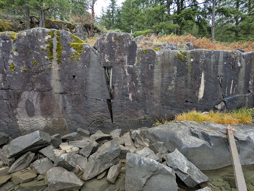 Read moreMy touristy group of eight (8) adults came to Sproat Lake Park to see the petroglyphs. Carved into a vertical rock face by First Nation peoples long ago, the petroglyphs are just above the water line and visible from a nearby floating deck. It's an easy, short hike on safe, mostly level paths through some woods that run parallel above a shoreline, which borders a HUGE lake. And then a secure ramp lets you walk down to a floating, tethered platform deck, from where you can see and inspect the petroglyphs from a respectful distance. The various carvings look like stylized fish, waves, and other creatures you may have better luck identifying. Then turn around and look at the expansive lake, the occasional boater, and the gorgeous mountains in the distance. What a view - and definitely...
