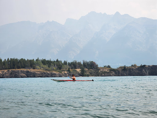 The last 2 miles to the campground are a dirt road. Sedans can make it but may hit bottom if the ruts are driven incorrectly. SUV's, and trucks will easily make it. Cost of a site per night is 18 Canadian as of 8/23. The campsites are laid out nicely, giving each site the room to park, cook, and set up tents in a comfortable fashion. Their are two vault toilets and a hand pump for potable water. The "put in" to the lake is a simple gravel road to the lake, lined by large boulders. Signs explain history and other information and express the need for heeding safety protocol due to grizzly bears that live in the area. Grizzlies have been seen passing through the campground...